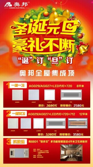 2015年元旦之際,奧邦年關巨作“8801智多芯取暖器”上市特惠,買就送4平米衛生間板材。如果您的新家要裝修的話,在這個圣誕元旦的好機會來奧邦全屋集成頂門店感受體驗,盡情選購吧。