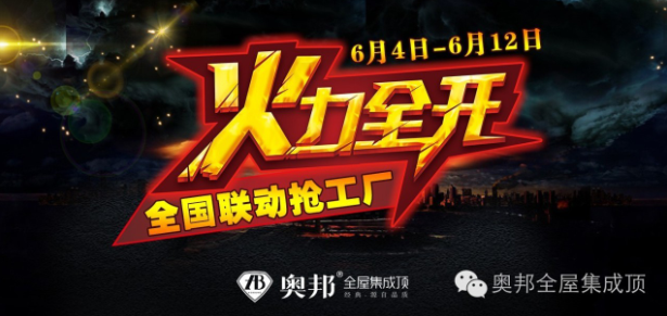 現(xiàn)小編了解到:為了能夠讓更多的消費者擁有既健康又時尚的家居生活,現(xiàn)奧邦全屋集成頂特別推出“6月4日-12日,火力全開”大型全國聯(lián)動促銷活動!