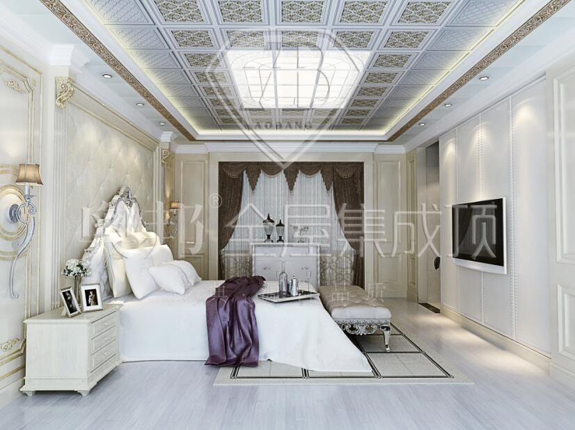 白色,是一種包含了光譜中所有顏色光的顏色,明度較高,因此不僅能與各色系搭配,同時也容易與其它色調形成強烈的比對。整個床白的設計,加上夢幻紫色的絲質家紡,柔軟質感與溫馨色調給人異常的舒適感。抬頭,舒緩的燈光與精致的頂上風光,襯托出高貴優雅以及奢華的風情。